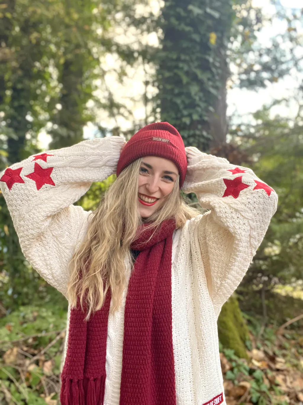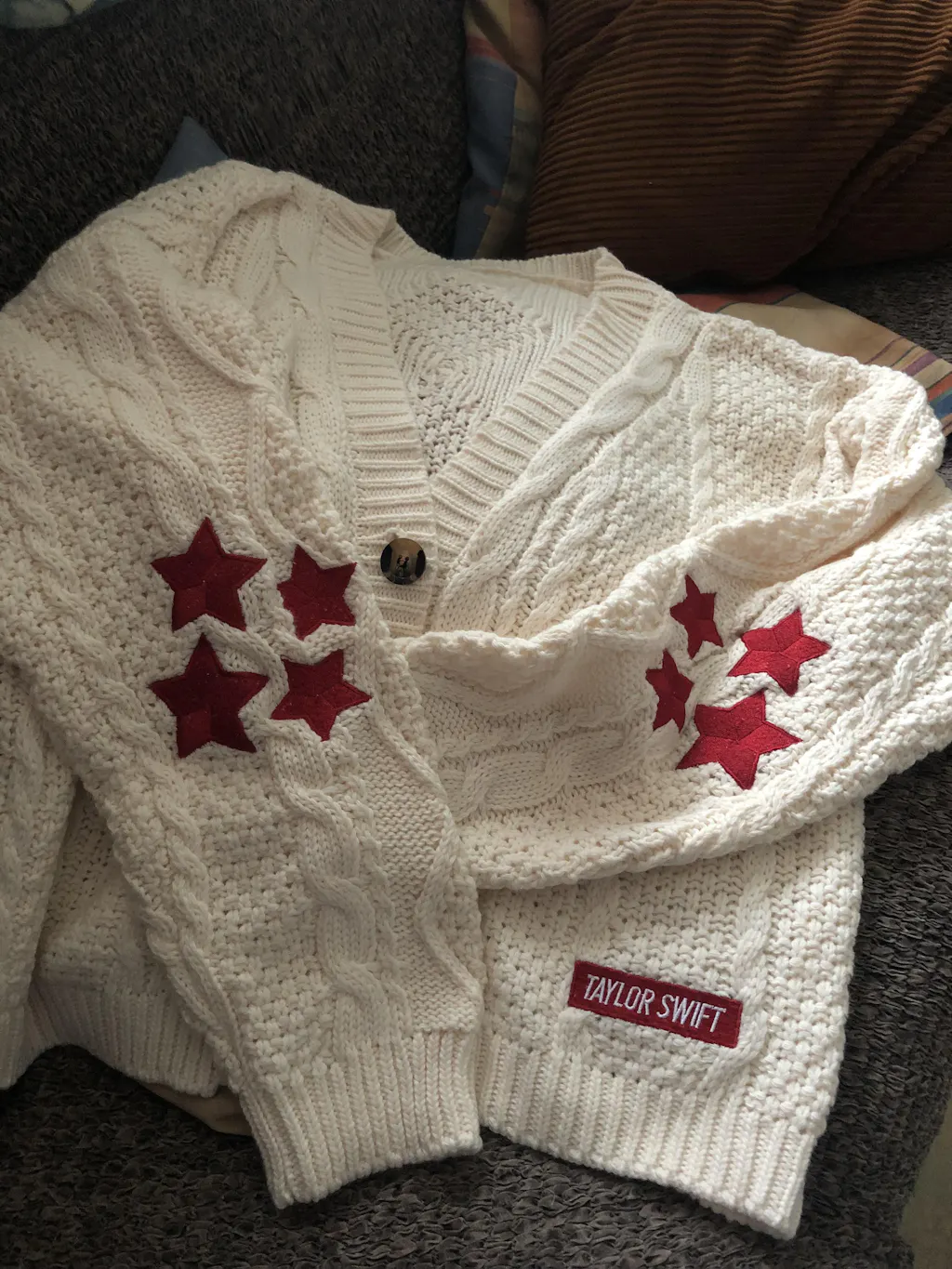 Introducing the Red Taylors Version Cardigan, a cozy masterpiece perfect for chilly holiday days. Crafted with soft, warm fabric, this V-neck sweater features long sleeves for extra comfort. Inspired by Taylors Version, it's an official nod to the iconic album, adorned with charming red stars. Embrace the nostalgia and wrap yourself in the warmth of this stylish garment, blending timeless fashion with a touch of music history.