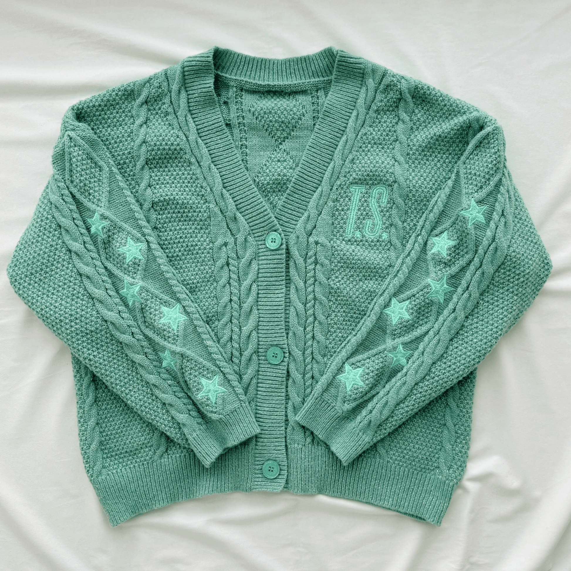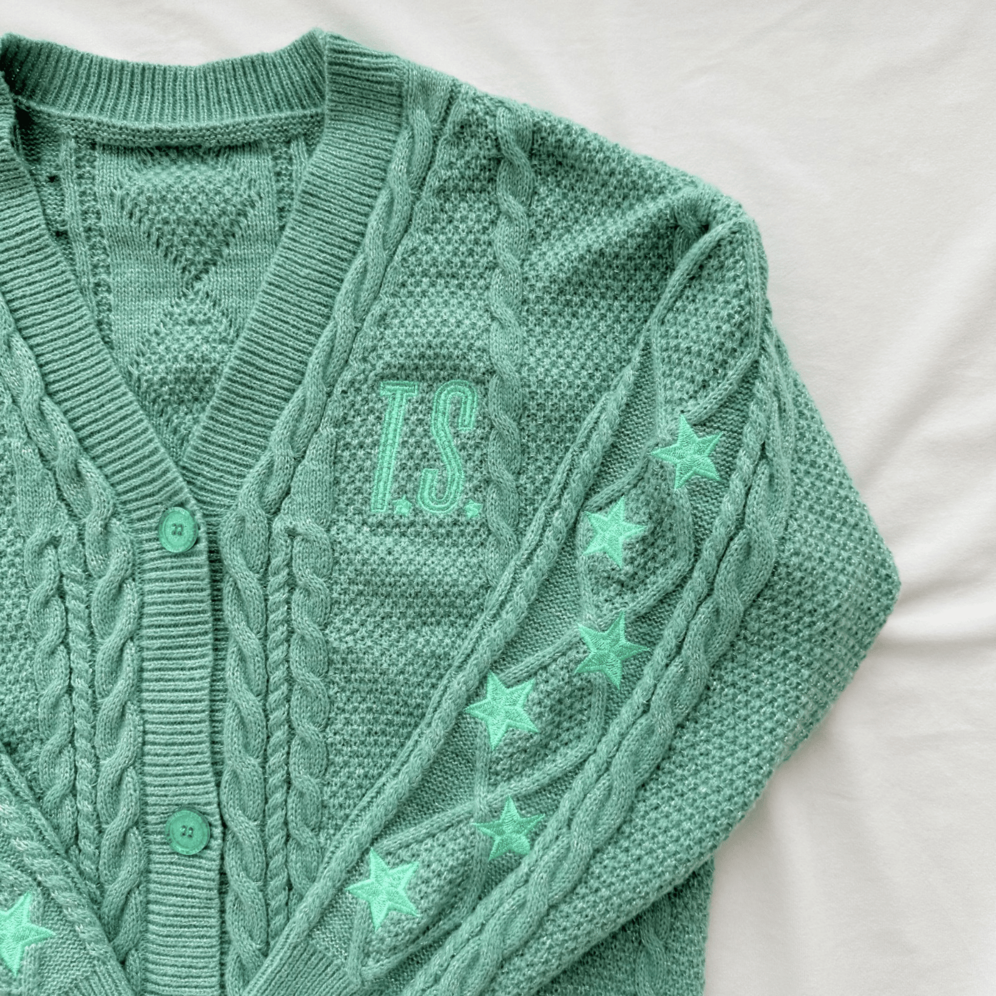 Show your inner Swifties with this and a stylish Showgirl cardigan, adorned with a charming blend of soft beige and green, delicate embroidered stars, inviting you to sparkle with confidence and shine in the spotlight of any showgirl moment.