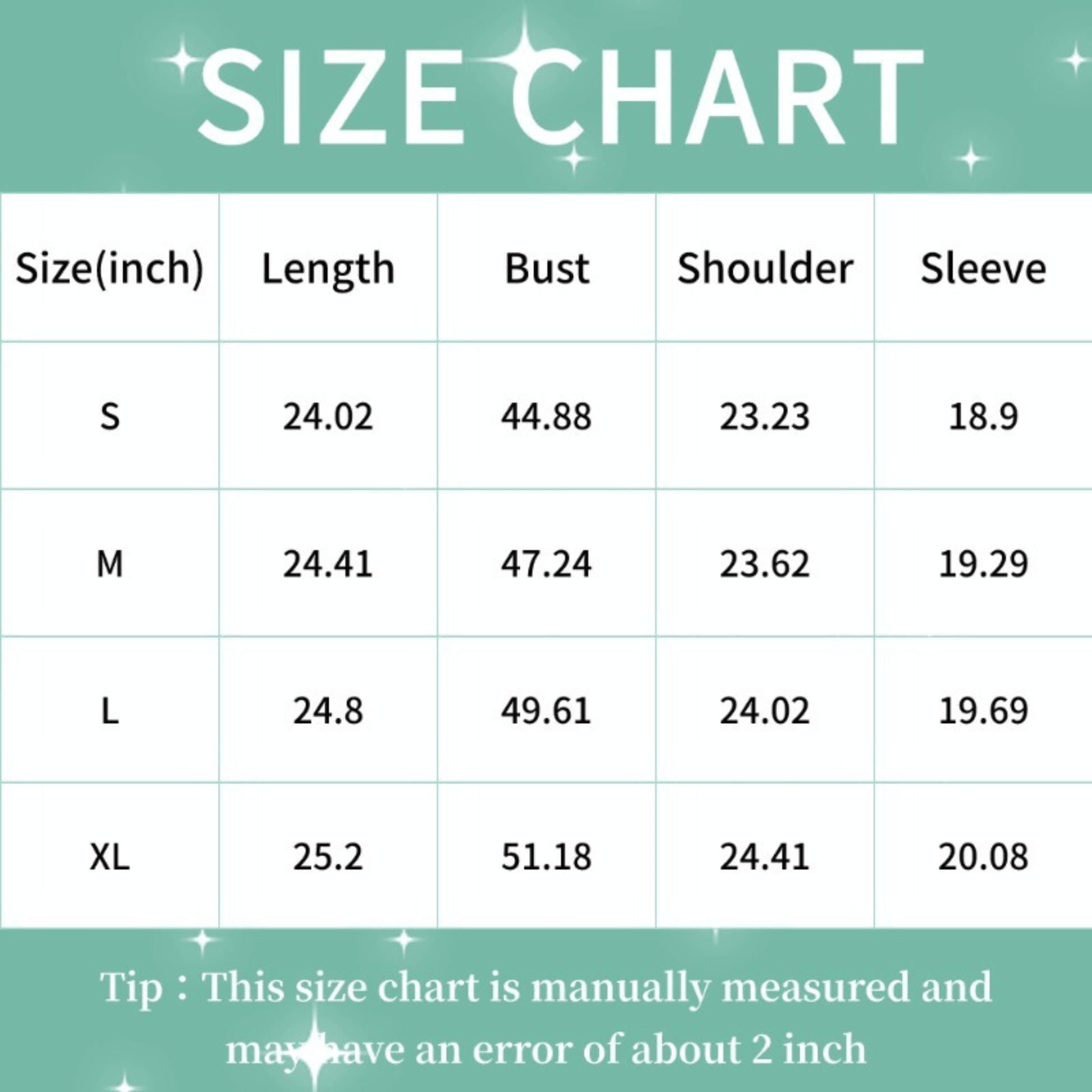 All products are measured manually, with a slight error of 0.8 to 1.2 inches (2 to 3 cm).